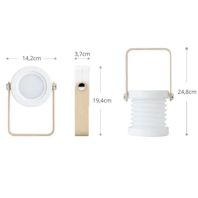 Lanterna LED USB dobrável com brilho ajustável, feita de PC, ABS, madeira e folha de ferro. Pode ser usada como lâmpada de mesa, cabeceira ou lanterna, com alça de madeira para transporte ou pendurar. Possui três níveis de brilho ajustáveis e recarga via USB com bateria de lítio integrada.
