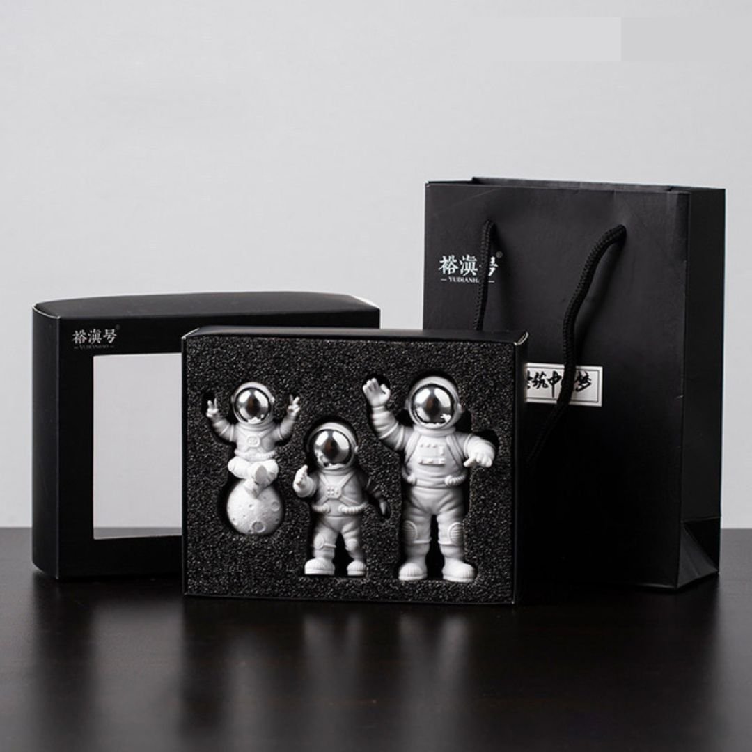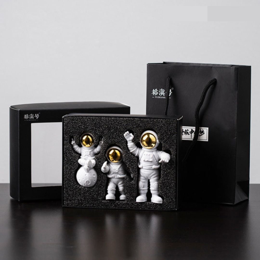 Produzidos em resina e PVC, estão disponíveis em duas cores: prata e dourado. Há versões com a lua (que conta com iluminação) ou apenas os três astronautas sem a lua, perfeitos para compor qualquer espaço.