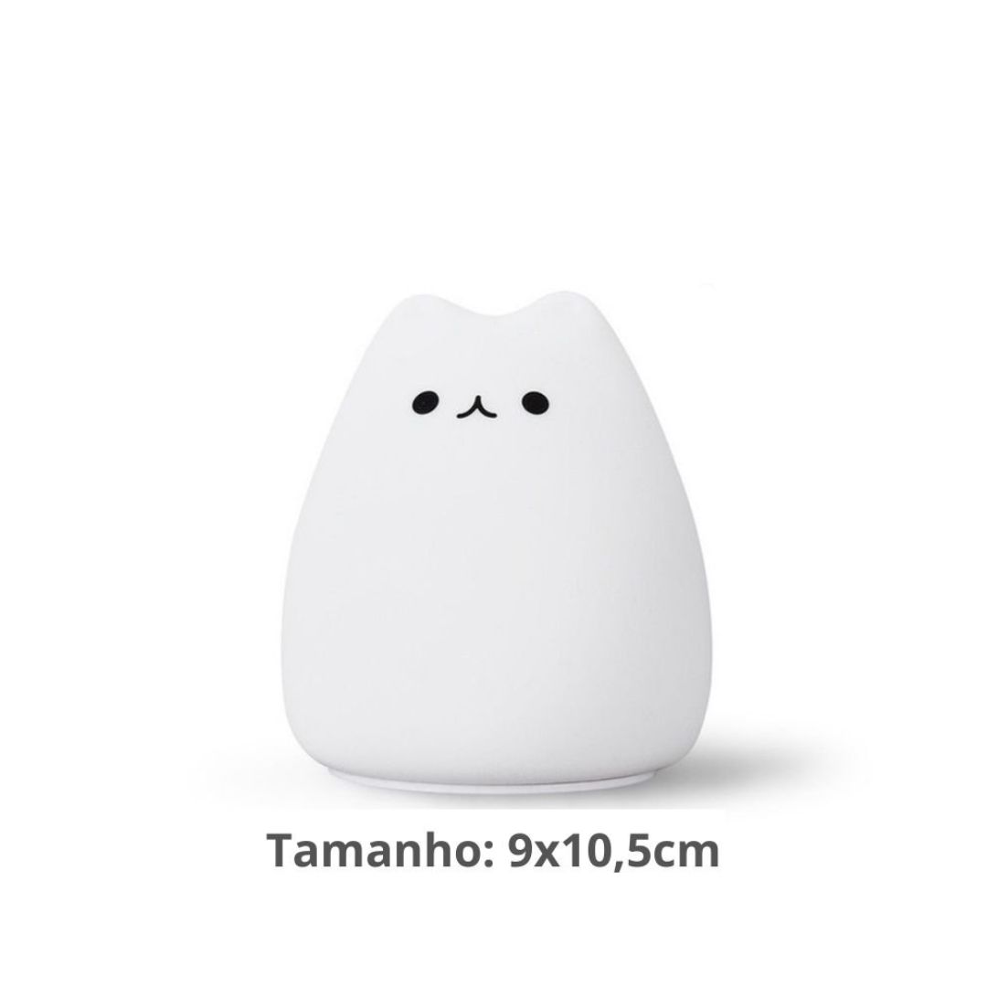 A luminária LED em formato de gatinho possui superfície de silicone macio e livre de BPA. Seu design permite mudança de cor ao toque, oferecendo até 7 opções de iluminação em tons suaves.