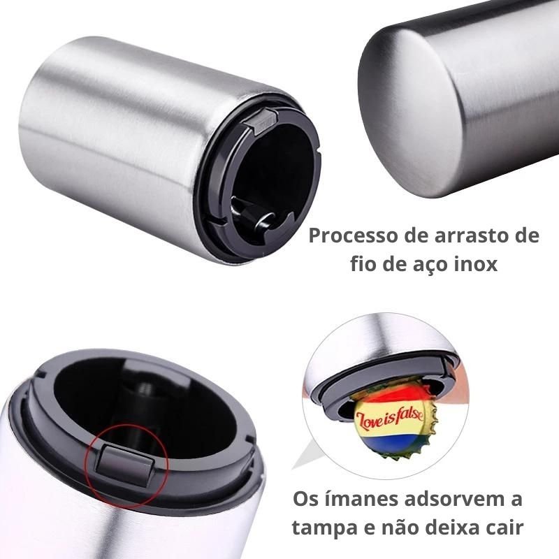 Basta pressionar para baixo para remover a tampa de forma rápida e prática. Possui funcionalidade dupla: além de abrir garrafas, conta com um ímã que mantém a tampa presa, sem deformá-la — ideal para colecionadores.