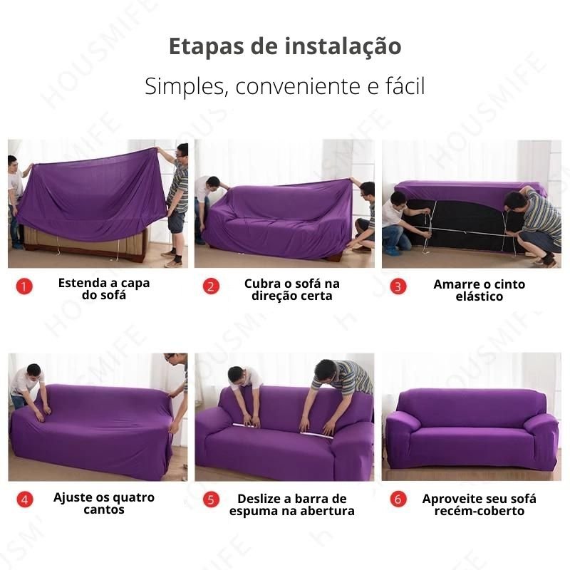 Fácil instalação: basta cobrir o sofá e inserir as barras nos cantos para um encaixe perfeito.