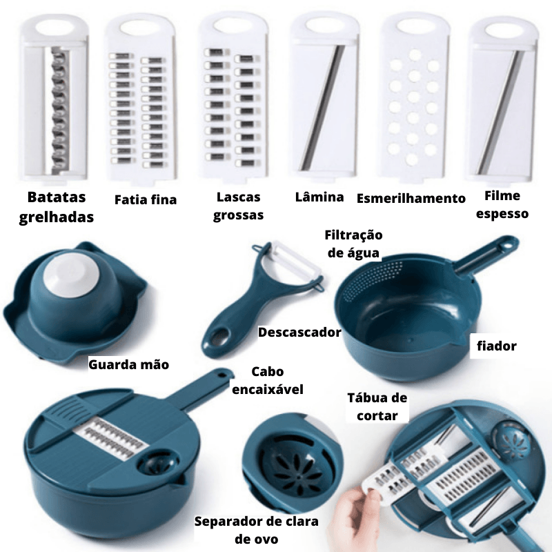 O cortador de legumes multifuncional é ideal para quem busca praticidade no preparo de alimentos. O conjunto inclui 6 lâminas em aço inoxidável 420, oferecendo diferentes opções de corte, como julienne fino, julienne grosso, ondulado e tradicional.